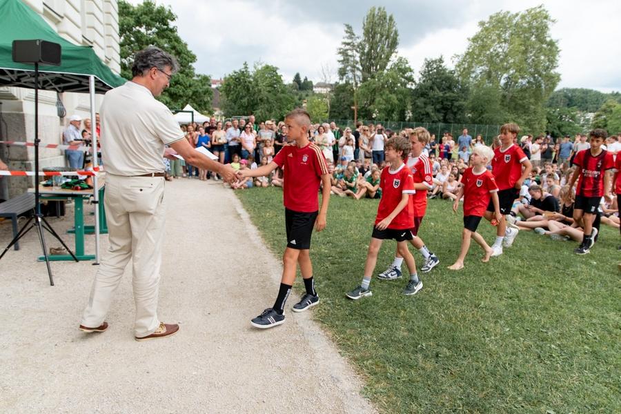 Am Freitag, 27. Juni, war es endlich wieder so weit. Das Schulfest läutet am Stiftsgymnasium traditionell die letzte Schulwoche ein, in der die Klassenzimmer als Lehr- und Lernstuben eine Weile ausgedient haben, und so fand sich die Schulgemeinschaft in der Früh auf dem Gelände vor dem Schulgebäude ein. Während einige Eltern schon fleißig Stände aufbauten, um für das leibliche Wohl zu sorgen, begann auf den Sportplätzen das Fußball- und das Volleyballturnier, von der Fachschaft Sport wieder hervorragend organisiert! In gewohnter Manier bildeten die Sportbewerbe den roten Faden durch das ganztägige Schulfest.