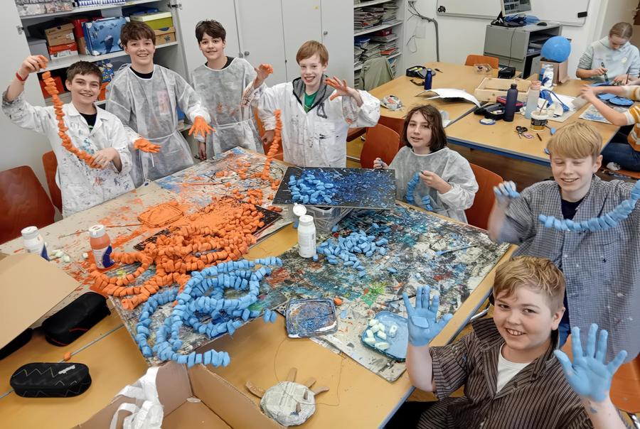 Alles begann mit einer Aufforderung an die ganze Schulgemeinschaft, diverse Plastikverpackungen und Kartonagen zu sammeln. So können Joghurtbecher zu Fischen, Noppenfolien zu Quallen sowie alte Kartons zu Haifischen, Schildkröten und Mantarochen werden. Diese fabelhaften Meerestiere aus etwas zu bauen, das auf den ersten Blick keinen Wert mehr hat und weggeworfen wurde, ist nicht nur für unsere Schülerinnen und Schüler ein erfüllender, sinnstiftender Prozess, sondern fördert auch ihre Kreativität und befriedigt ihren Schaffensdrang. Ein Beweis dafür ist die Motivation und Freude, mit der sie ans Werk gehen.