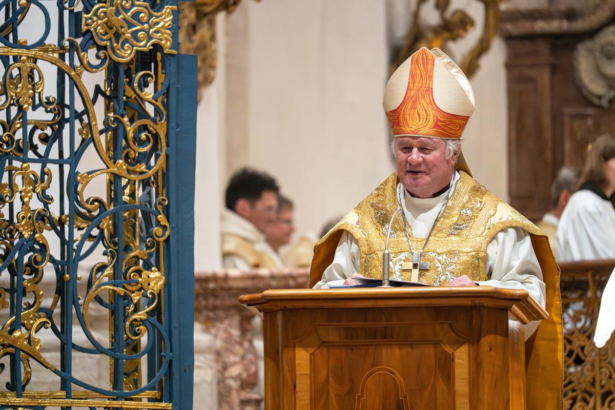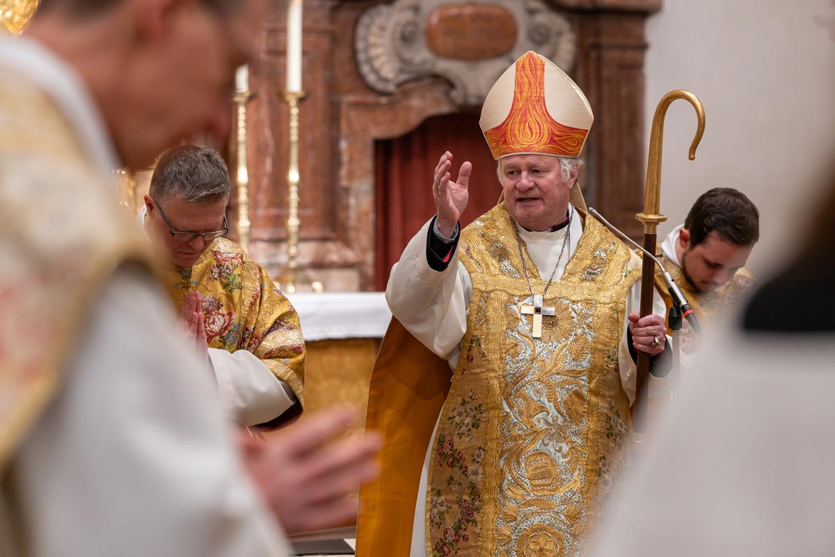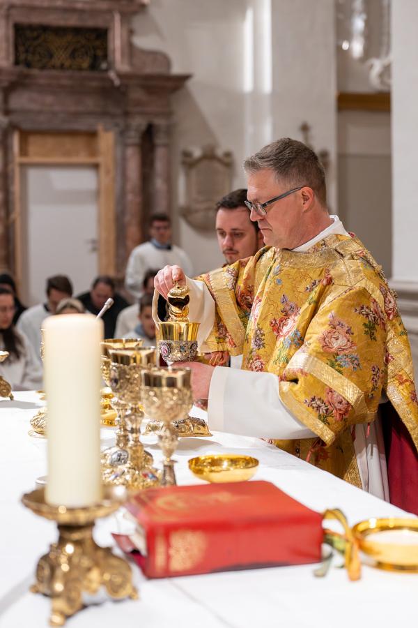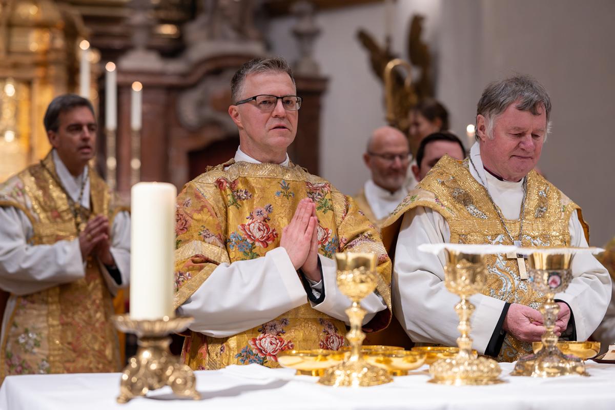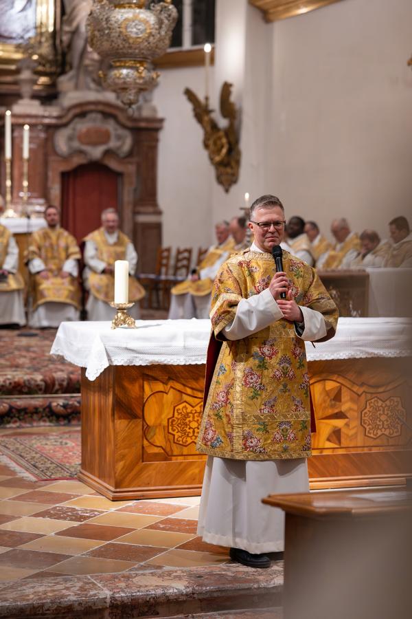 In der persönlich gehaltenen Predigt ging der Bischof auf die Lebensgeschichte unseres Mitbruders ein. Der Weg zum geistlichen Amt sei für ihn „keine Gerade einer Autobahn“ gewesen, die verschiedenen Stationen als Bauspengler, Wasserleitungsinstallateur und Krankenpfleger aber zu „Bausteinen der Berufung“ und „Nährboden der Seelsorge“ geworden. In ihnen gehe es ums Bauen wie bei Jesus, der selbst einen ähnlichen Beruf gehabt habe, um das lebensspendende Wasser sowie um Gesundheit und Heilung, was ihn in den Aufgaben im Kloster nun begleite. Die Verkündigung – gerade des Evangeliums – und die Liturgie gehörten zum Kern seiner Berufung als Ordensmann und auch zum Diakon. Als solcher, so der Bischof weiter, sei fr. Jakobus gerufen, Licht für andere Menschen zu sein als einer, der sich von Gott geliebt weiß. Dabei verstehe er die Diakonie als ein „sich Gesellen zum Menschen in all seinen Situationen“, als ein „Nachgehen und Nachwandern in die äußersten Verlorenheiten und Verstiegenheiten“ besonders der Verwundbaren. Um das zu schaffen, brauche es eine „innere Widerstandskraft, um nicht von Wind, Zeitgeist und Krisen umgeweht zu werden“ sowie eine „menschenwürdige Ordnung“, wie sie in der Regel des heiligen Benedikt mit ihrem Fokus auf das Wort Gottes, auf Liturgie, Gemeinschaft und Gebet zu finden sei. So gehöre es zur Diakonie auch, „Menschen in den gute ordo (Ordnung) des Glaubens mitzunehmen“. Am Ende gab Bischof Manfred den Zuhörenden ein Wort von Viktor Frankl mit, das ihm für Nachfolge und Berufung sehr wichtig scheine: Dass es nämlich nicht darauf ankäme, was wir vom Leben zu erwarten hätten, sondern, was das Leben von uns erwarte, was ich an Hoffnung zu geben vermag.