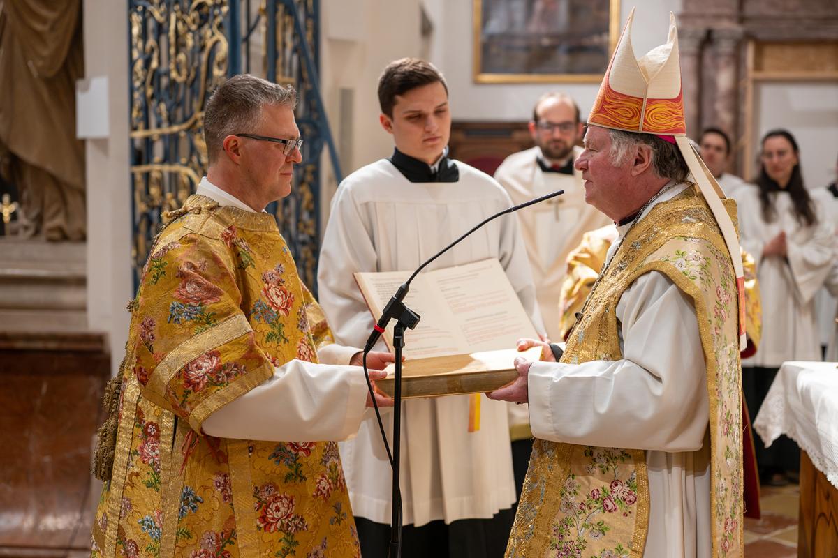 Auf die Homilie folgte die eigentliche Weihehandlung, in der fr. Jakobus auf die Fragen des Bischofs laut und deutlich sein „Ich bin bereit“ sprach – vor allem, wie es in der letzten Frage heißt, mit Gottes Hilfe bereit zu sein, das eigene Leben nach dem Bild und Beispiel Christi zu gestalten. Die Handauflegung des Bischofs und das folgende Weihegebet mit seinen ausdrucksstarken Bildern bildeten den Kern der Feier; hier wurde aus Frater Jakobus der Diakon Pater Jakobus, dem zum Zeichen seines neuen Amtes die Stola und die Dalmatik angelegt und das Evangeliar übergeben wurden. Ab da hatte der neugeweihte P. Jakobus seinen Platz rechts neben dem Bischof und übernahm alle Aufgaben des Diakons in der Liturgie.