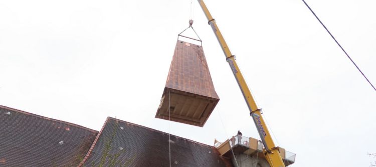 Im Februar wurde die neue Dachstuhlkonstruktion samt Kupfereindeckung als Ganzes auf das Turmgemäuer gehoben. Das Gesamtgewicht des Turmdaches beträgt 15 Tonnen. Der Dachstuhl wurde aus ca. 30 Festmeter wintergeschlagenem Fichtenholz gefertigt und die Mauerbänke aus Eichenholz. Das gesamte Holz und die Kupferblechbahnen sind eine Spende des Stiftes Kremsmünster.