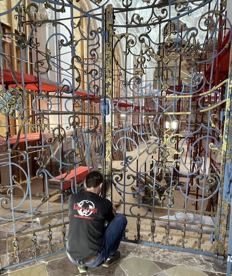 Im Sommer wurden auch die Metallgitter gereinigt und bearbeitet. Sie erhalten wieder den originalen barocken Farbton Blau. Dazu wurden einige Probeanstriche vorgenommen. Die Vergoldungen an den Gittern konnten zum Teil gereinigt werden, stellenweise müssen Neuvergoldungen aufgetragen werden.