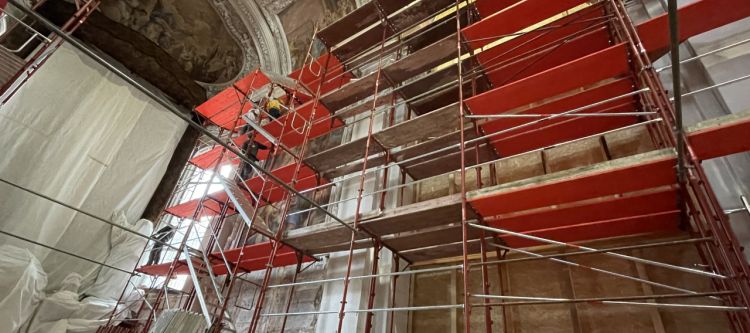 Nach dem ersten intensiven Jahr der Innensanierung der Stiftskirche pausieren über die Weihnachtsferien die Arbeiten. Mit der Reinigung von Stuck und Fresken im Bereich des Hochaltars werden die Arbeiten im Jänner wieder aufgenommen. Zur Vorbereitung darauf wurde im Dezember 2023 auch das Presbyterium eingerüstet.