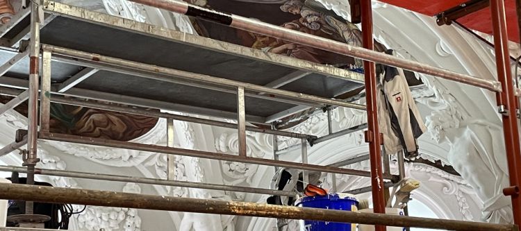 Die neuen Farben von Stuck und Fresken leuchten schon durch das Gerüst.