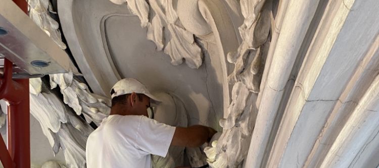 In einer Höhe von 18 m werden der Stuck und die Fresken bearbeitet, die aus der zweiten Hälfte des 17. Jh. stammen. Auch wenn die barocke Farbigkeit noch überwiegend wahrnehmbar ist, so zeigen die Jahrhunderte ihre Spuren. Um die barocke Farbigkeit wieder ganz zum Ausdruck zu bringen, wird zunächst trocken gereinigt. Anschließend werden die Risse bearbeitet.