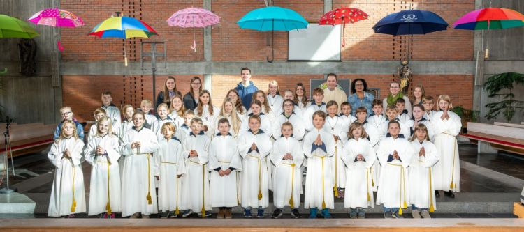Im Herbst werden jedes Jahr die neuen Ministranten in einem von uns gestalteten Gottesdienst offiziell in die Mini-Gemeinschaft aufgenommen. Anschließend wird beim gemeinsamen Oktoberfest-Frühshoppen noch etwas gefeiert. Hier Link zu einem kurzen Video von dieser Aufnahmefeier. Sie stand unter dem Motto: „Unter Gottes Schutz und Schirm“: https://youtu.be/ipB2vzG6OwI