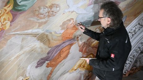 Die neuen Farben von Stuck und Fresken leuchten schon durch das Gerüst.
