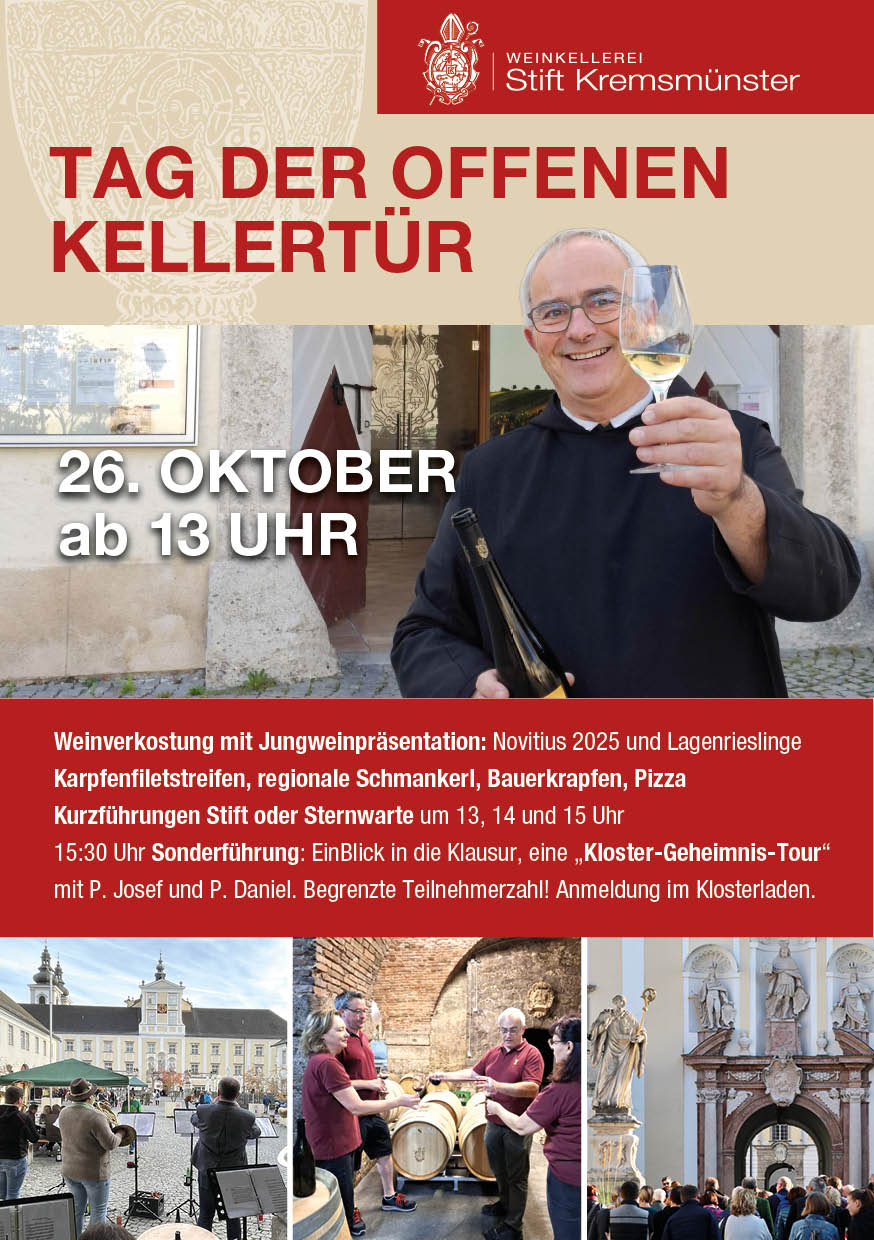 | Das Kellereiteam lädt am 26. Oktober, ab 13 Uhr herzlich ein zum Tag der offenen Kellertür mit Jungweinverkostung und kulinarischen Schmankerln. | Neue und altbewährte Weine aus dem Sortiment können verkostet werden. Highlight ist, wie jedes Jahr, die Präsentation des Jungweines Novitius und der neuen Lagenrieslinge Riesling Schütt und Steiner Hund. Neu ist erstmals ein Gemischter Satz aus der Riede Gebling, einer der ältesten Stiftsweingärten. Kellermeister Pater Siegfried empfiehlt auch im Holzfass gereifte Rotweine aus dem Burgenland, z.B. Blaufränkisch, Merlot oder Cuvée Benedictus. Wer gerne Pickelndes möchte: Neu im Sortiment ist der Spumante vom Blaufränkisch Rosé.