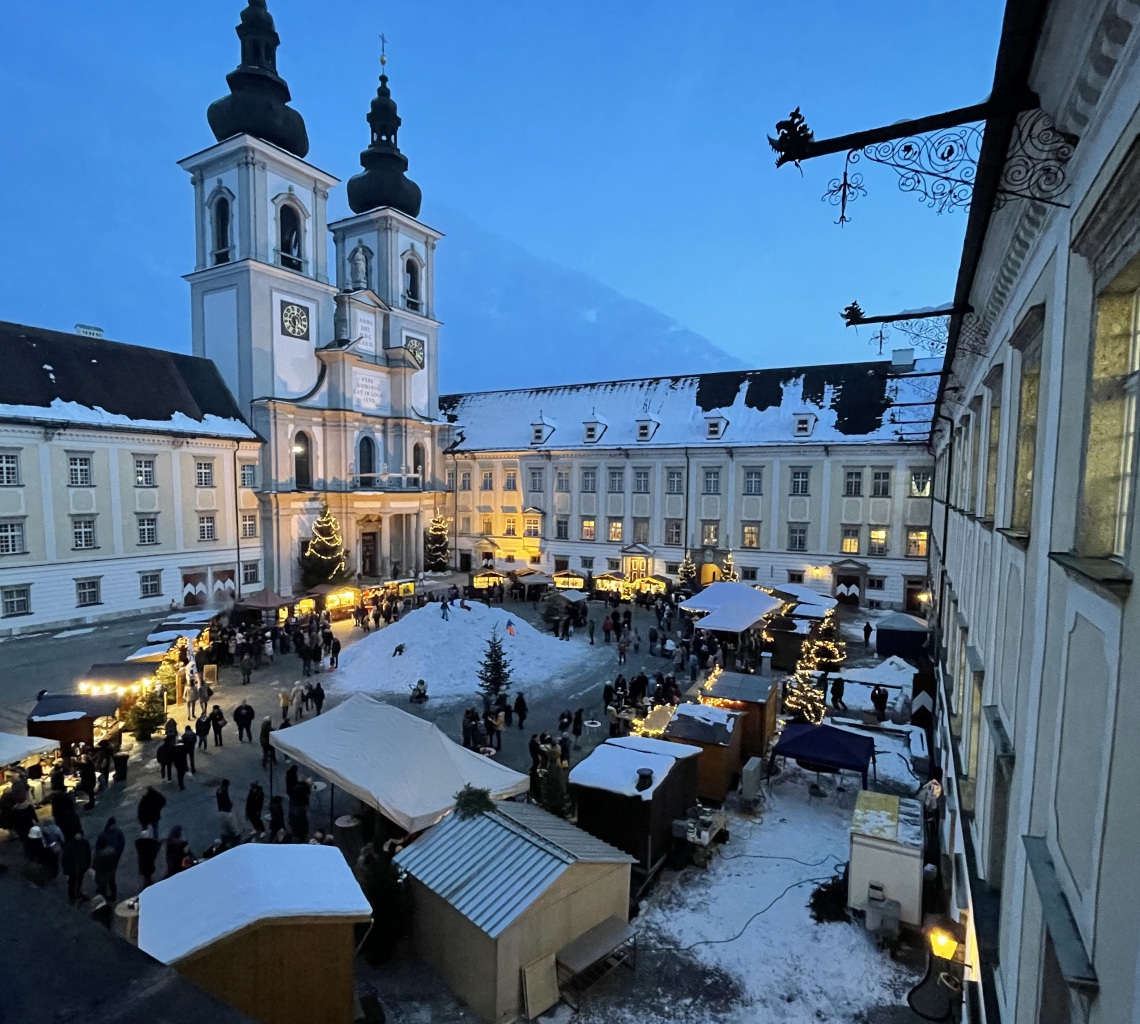Weitere Highlights aus dem Programm | Samstag, 6. Dezember, 15:00 Uhr Alpenländische Weihnacht mit der Landesmusikschule Kremsmünster. Theatersaal | | Sonntag, 7. Dezember, 15:30 und 17:00 Uhr Adventsingen der Chorklassen des Stiftsgymnasiums. Akademischen Kapelle | | Montag, 8. Dezember, 14:00 Uhr „Petzbär und der Weihnachtswichtel“, Handpuppenspieler Max Wully. Kaisersaal | | Adventmarkt Öffnungszeiten | 6.-8. Dezember 2025, jeweils von 9:00-18:00 Uhr Eintritt: Erwachsene € 5,-; Kinder bis 15 J. € 2,- | | | |