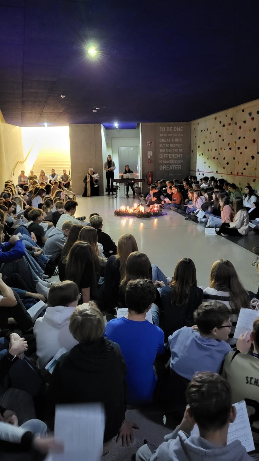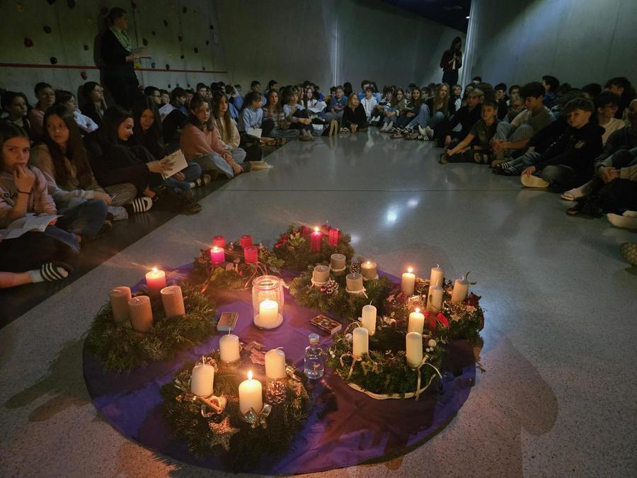 Am Montag, den 1. Dezember 2025 versammelte sich unsere Schulgemeinschaft an drei Orten des Stiftsgymnasiums – in der Aula, im Verbindungsgang beim Turnsaal sowie in der Akademischen Kapelle, um mit der traditionellen Adventkranzsegnung in die Adventzeit zu starten.