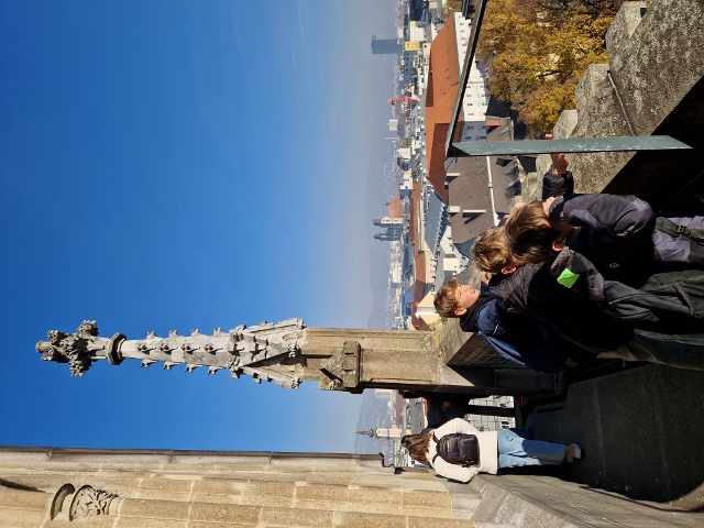 Ein Höhepunkt des Vormittags war die Führung durch den Mariendom, bei der die Schülerinnen und Schüler auf besonderen Wegen über die Galerie und den Dachboden bis hinauf in den Glockenturm gelangten. Auch die beeindruckenden Fenster und ihre Symbolik wurden dabei thematisiert und sorgten für großes Interesse.