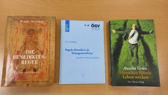 Nach einer Auswahl aus dem Prolog standen die Kapitel über das von Benedikt vorgesehene Profil für die Persönlichkeit des Abtes, über Demut und das Amt des Cellerars (Wirtschafters) im Mittelpunkt der sprachlichen Betrachtung und der gemeinsamen Interpretation. Was der Ordensvater für Leitungsfunktionen vorsieht, lässt sich in verschiedenster Weise auf heutiges verantwortungsvolles und an den Bedürfnissen der Menschen orientiertes Führungsverhalten in Wirtschaft, Bildung und Verwaltung übertragen. Nicht umsonst gab es in letzter Zeit eine Reihe von Veröffentlichungen zu dieser Thematik. Beispielsweise seien Anselm Grün aus der Abtei Münsterschwarzach und Hans Hofinger (Altkremsmünsterer und Bankmanager, MJ 1969) genannt.