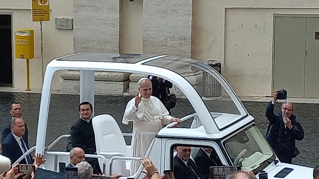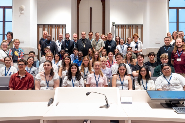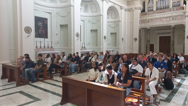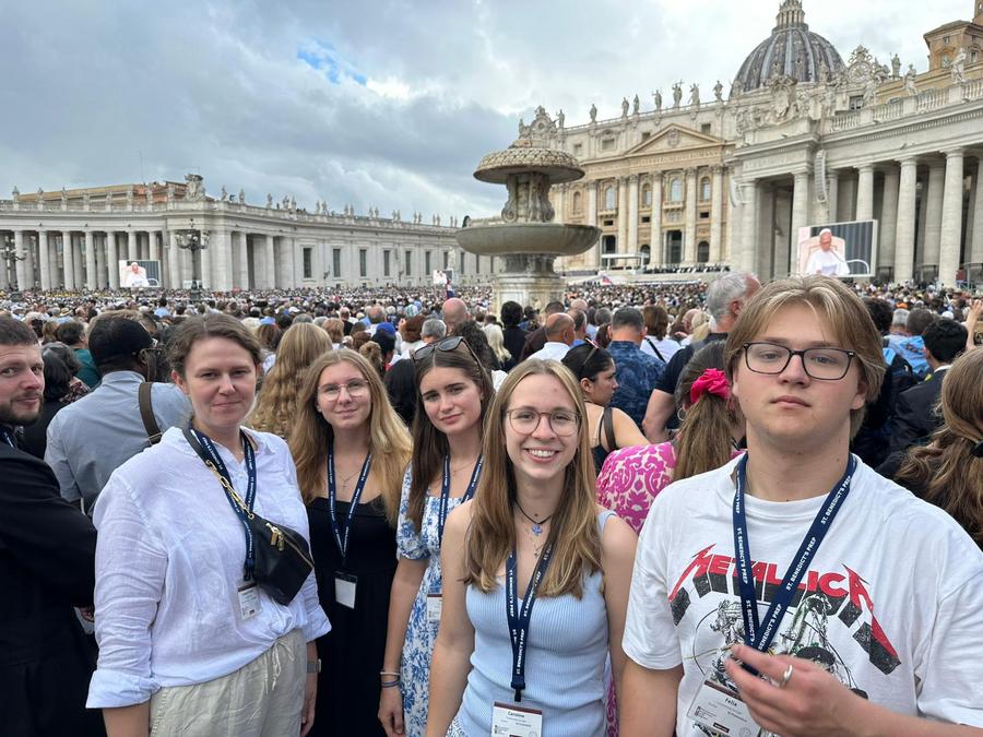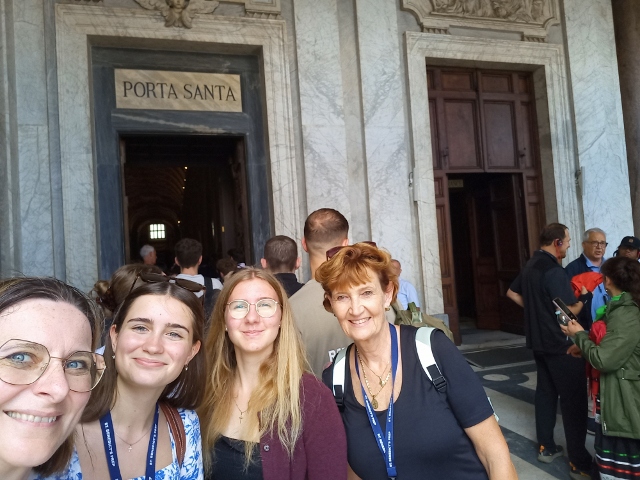 Der Aufenthalt innerhalb der Klostermauern des Collegio Sant’Anselmo auf dem Aventin sorgte für die nötige Ruhe im sonst sehr lebendigen und hektischen Rom. Der Tag begann mit einer Morgenandacht und einem Frühstück im Stillen im Refektorium der Mönche, es gab täglich einen Gottesdienst und eine Zeit der Bibelreflexion in Kleingruppen (Deanery) sowie eine Abendandacht, die jeweils von unterschiedlichen Ländern vorbereitet und gestaltet wurde. Dass die Arbeitssprache auf dem Kongress Englisch war, versteht sich von selbst. Auch Abtprimas Jeremias Schröder hat sich für die Jugendlichen Zeit genommen, beantwortete die vielen Fragen der jungen benediktinischen Pilger und feierte gemeinsam mit den Mönchen in Sant’Anselmo und der Gruppe des IBYC die Abschlussmesse des Jugendtreffens. Darüber hinaus besuchten die Schülerinnen und Schüler die Kirchen San Benedetto in Piscinula, Santa Cecilia, Santa Maria in Trastevere, San Paolo fuori le mura, Santa Maria Maggiore mit dem Grab von Papst Franziskus, das Kloster Santa Scholastica in Subiaco sowie Sacro Specro, wo Benedikt als Einsiedler gelebt hatte, und natürlich den Petersdom. Der Besuch des Petersdoms mit der Papstaudienz war das absolute Highlight der Woche. Wir waren alle sehr eingenommen und ergriffen von der Herzlichkeit und Offenheit, mit der Papst Leo in seinem Papamobil durch die Gänge zwischen den Menschenmassen fuhr, da und dort eine Hand schüttelte, ein Kind segnete oder jemanden anlächelte. Außer uns, den Benedictine Pilgrims of Hope, gab es noch zahlreiche andere Pilgergruppen, die nach Rom gekommen waren, um den Heiligen Vater zu sehen und zu erleben. Der Weg in den Petersdom führte uns schließlich durch das Heilige Tor, welches nur heuer im Heiligen Jahr geöffnet ist. Wir fühlten uns gestärkt vom Gemeinschaftsgefühl und voller Freude, Teil dieser großen Glaubensgemeinschaft zu sein.