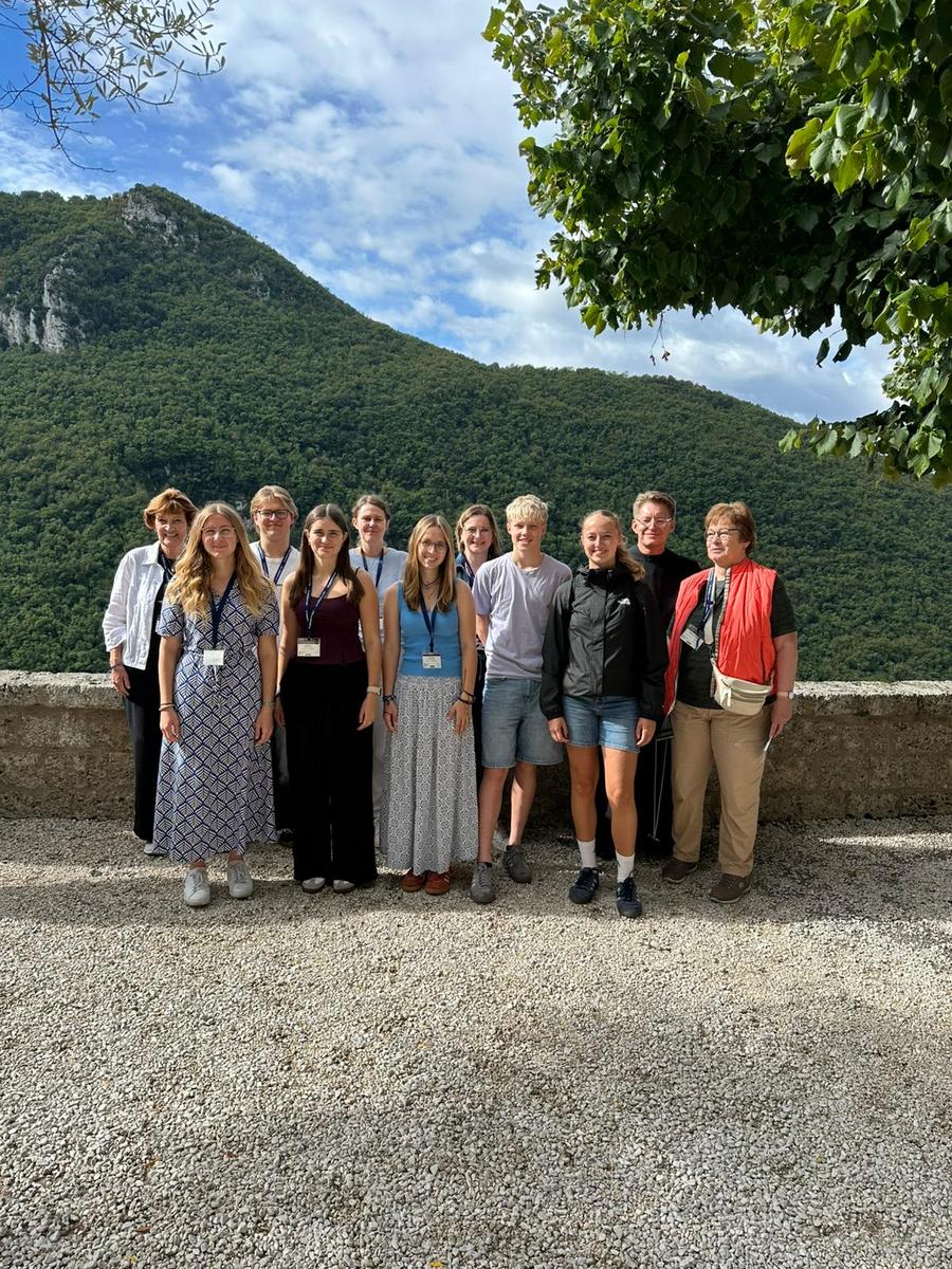 Gruppenfoto der deutschsprachigen Gruppe mit den Teilnehmenden aus Meschede/Königsmünster (Deutschland), Melk und Kremsmünster
