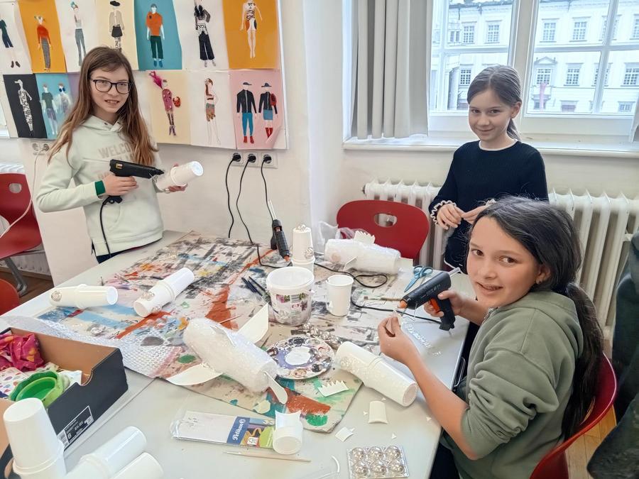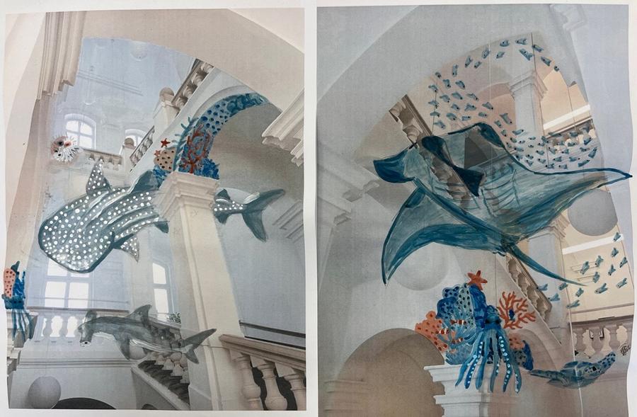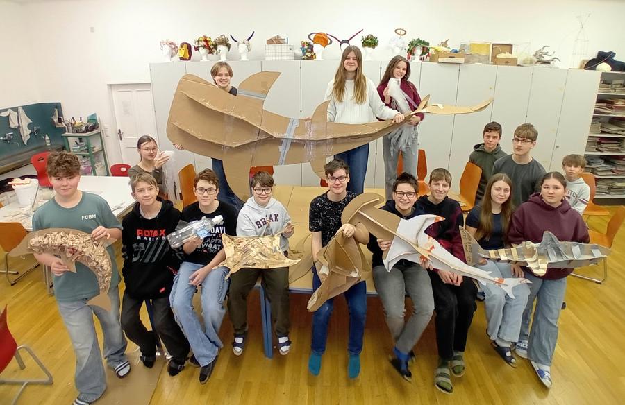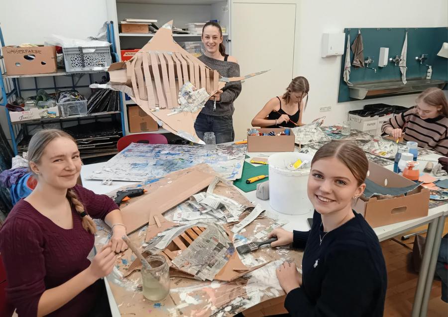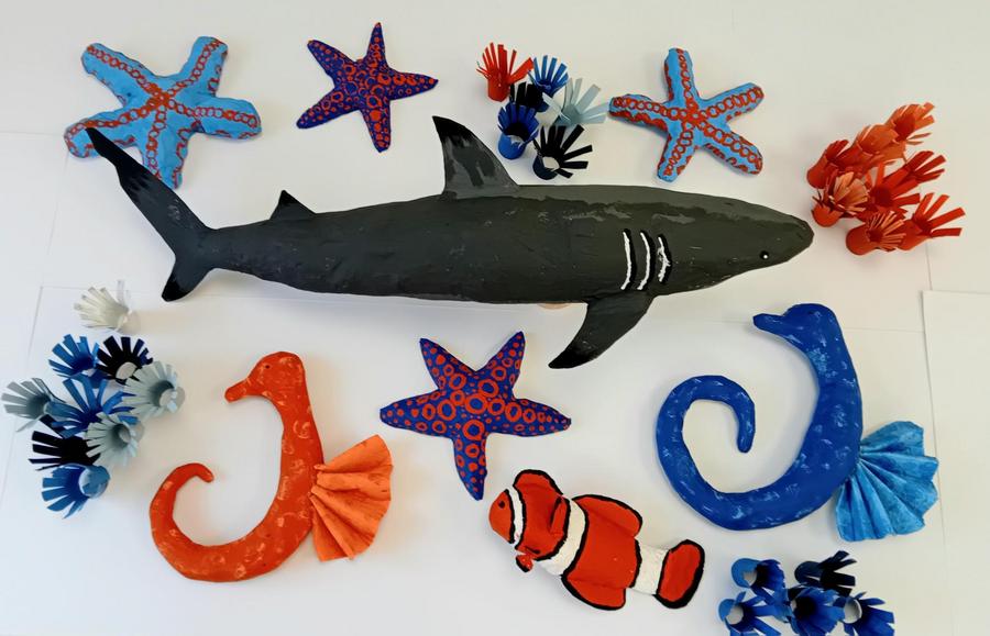 Alles begann mit einer Aufforderung an die ganze Schulgemeinschaft, diverse Plastikverpackungen und Kartonagen zu sammeln. So können Joghurtbecher zu Fischen, Noppenfolien zu Quallen sowie alte Kartons zu Haifischen, Schildkröten und Mantarochen werden. Diese fabelhaften Meerestiere aus etwas zu bauen, das auf den ersten Blick keinen Wert mehr hat und weggeworfen wurde, ist nicht nur für unsere Schülerinnen und Schüler ein erfüllender, sinnstiftender Prozess, sondern fördert auch ihre Kreativität und befriedigt ihren Schaffensdrang. Ein Beweis dafür ist die Motivation und Freude, mit der sie ans Werk gehen.