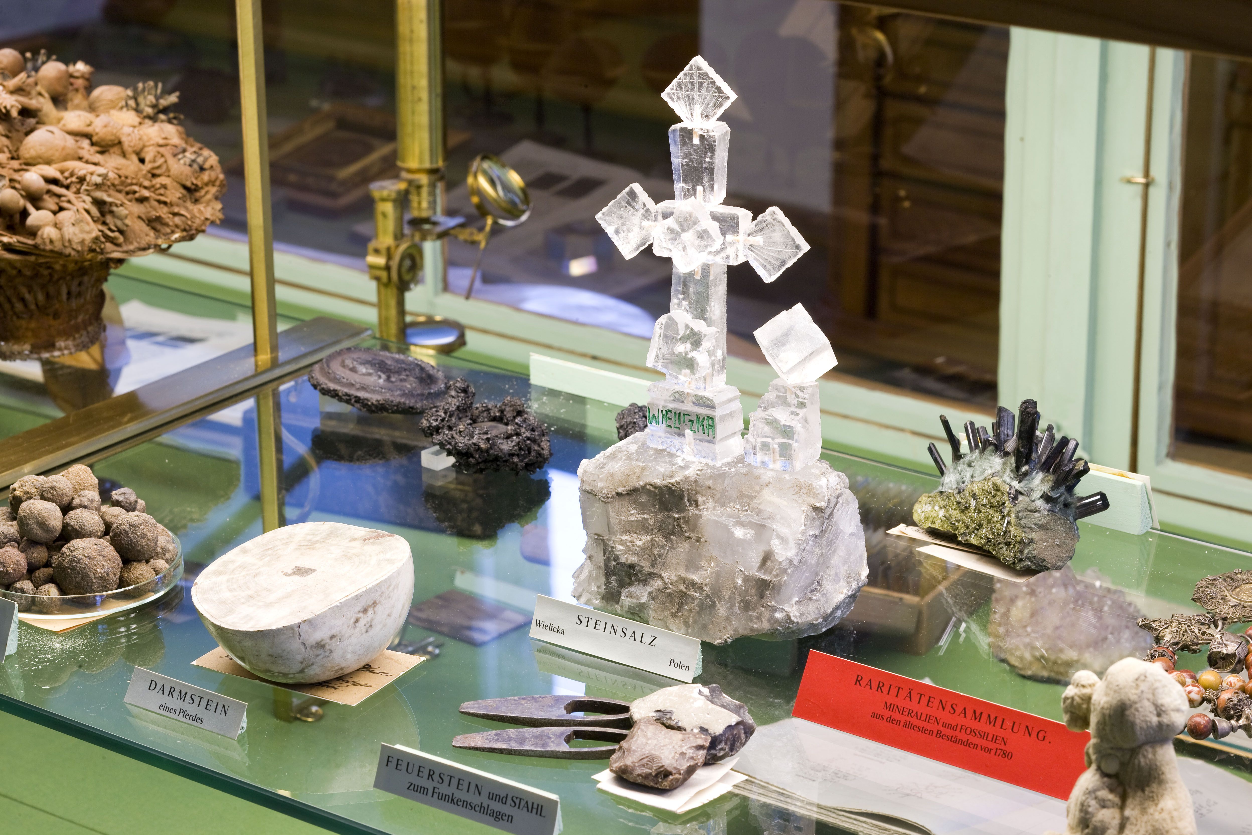 Im zweiten Stock können Sie eine Auswahl der etwa 12.000 Stücke umfassenden Mineraliensammlung in den einzigartigen Kästen aus dem 18. Jahrhundert bewundern.